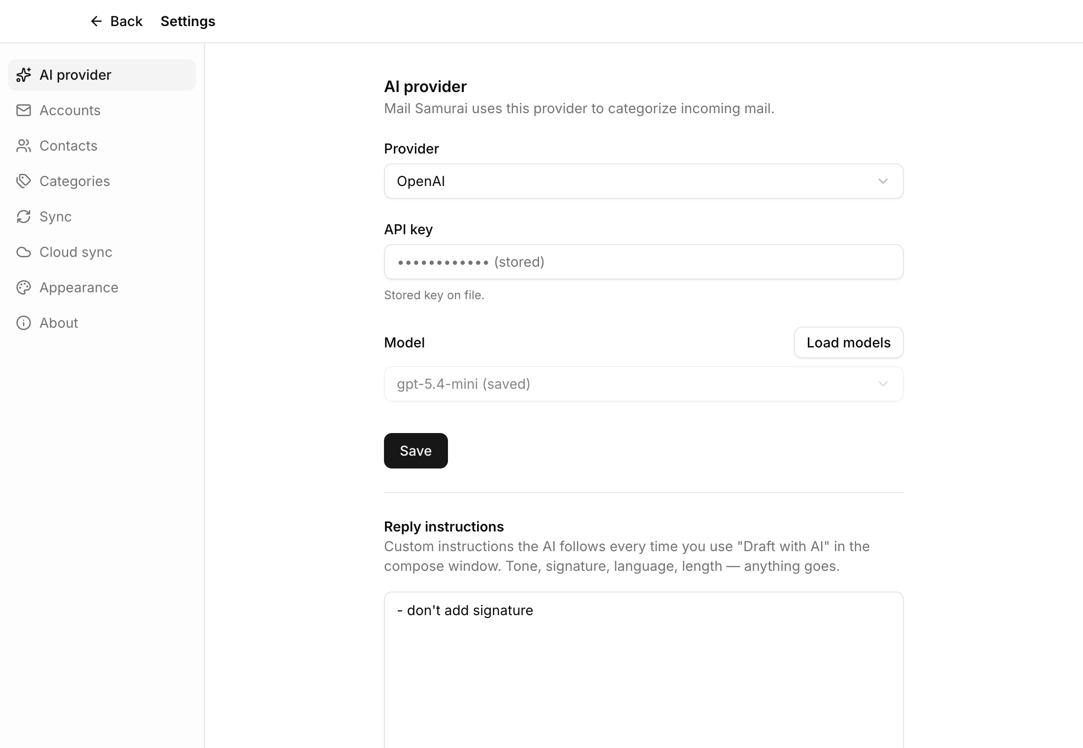 Mail Samurai connects to any IMAP account and uses AI to label every message the moment it arrives. Native macOS, open source, your keys.